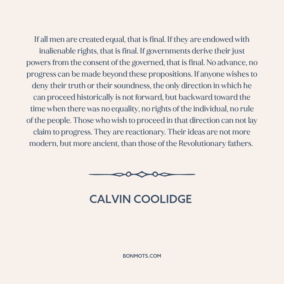 If all men are created equal, that is final. If they are endowed with inalienable rights, that is final. If governments derive their just powers from the consent of the governed, that is final. No advance, no progress can be made beyond these propositions. If anyone wishes to deny their truth or their soundness, the only direction in which he can proceed historically is not forward, but backward toward the time when there was no equality, no rights of the individual, no rule of the people. Those who wish to proceed in that direction can not lay claim to progress. They are reactionary. Their ideas are not more modern, but more ancient, than those of the Revolutionary fathers.