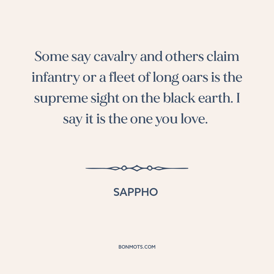 Some say cavalry and others claim infantry or a fleet of long oars is the supreme sight on the black earth. I say it is the one you love.