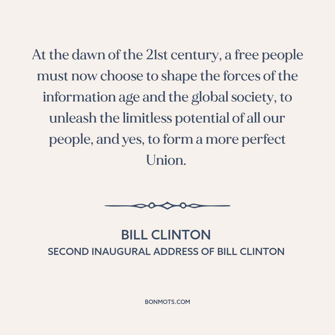 At the dawn of the 21st century, a free people must now choose to shape the forces of the information age and the global society, to unleash the limitless potential of all our people, and yes, to form a more perfect Union.