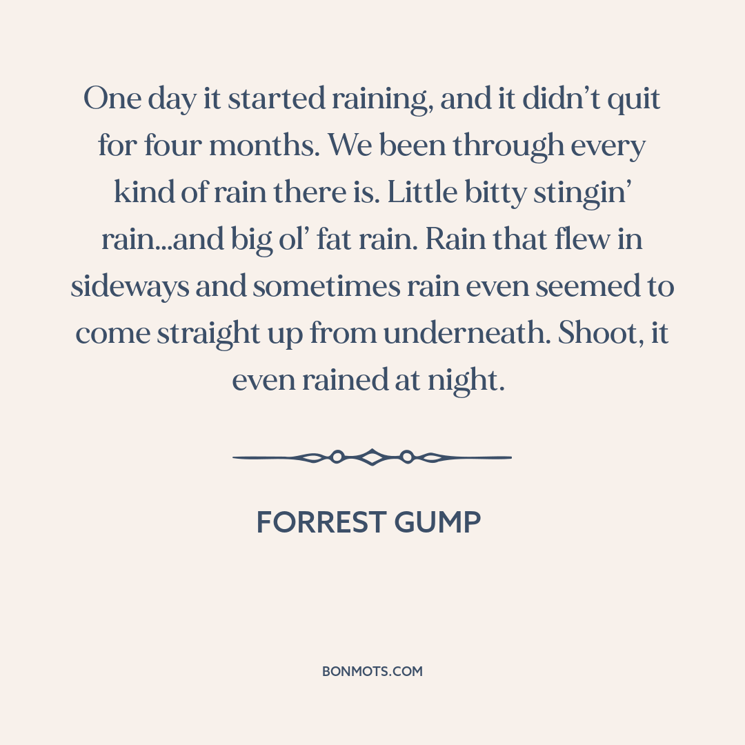 One day it started raining, and it didn’t quit for four months. We been through every kind of rain there is. Little bitty stingin’ rain…and big ol’ fat rain. Rain that flew in sideways and sometimes rain even seemed to come straight up from underneath. Shoot, it even rained at night.