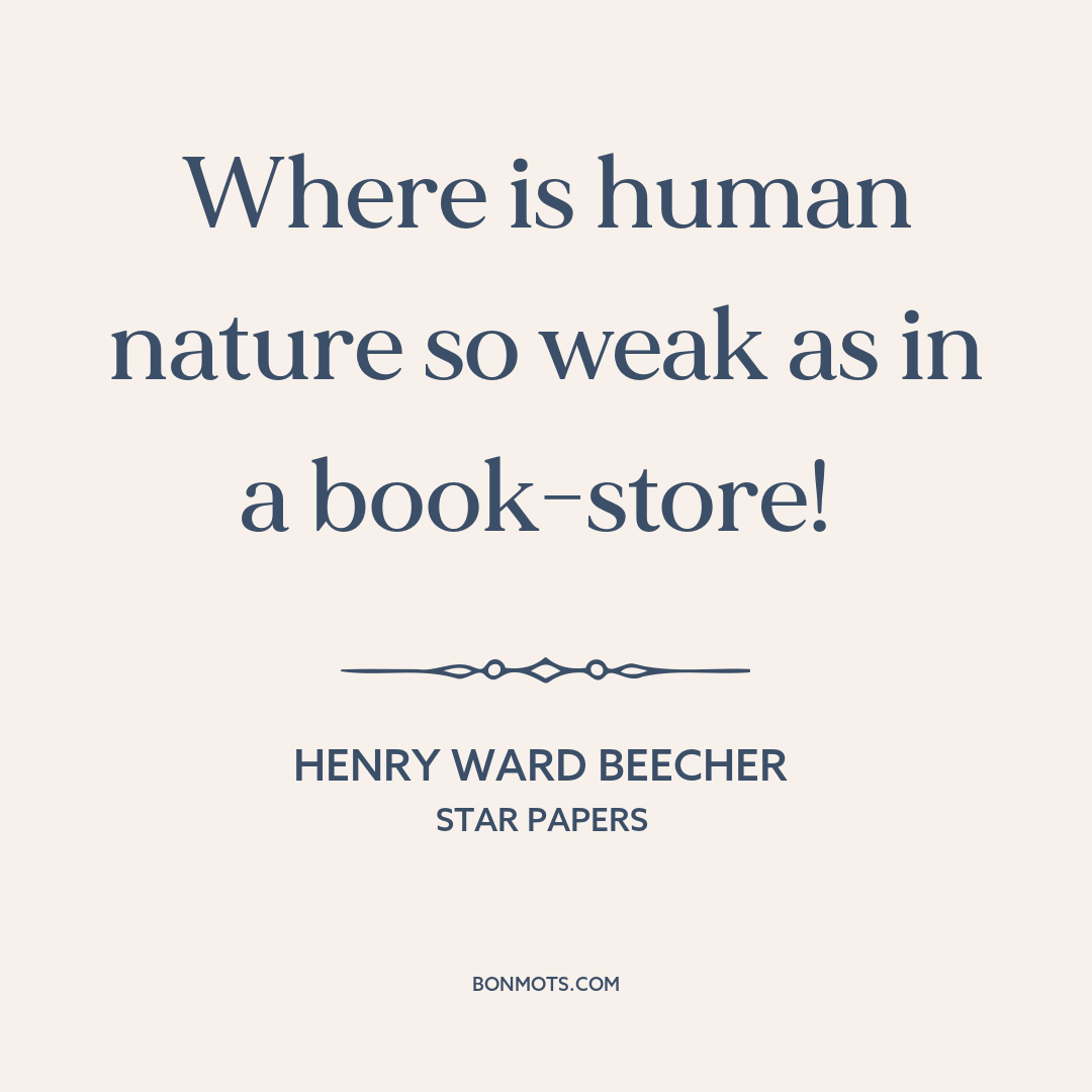 Where is human nature so weak as in a book-store! Henry Ward Beecher Star Papers There are no other quotes from this source in the Bon Mots database. Instagram sharing coming soon. Quote text and source copied to clipboard. Link to this quote copied to clipboard. More information about this quote Topic Books Author Henry Ward Beecher Source Star Papers Language English Time 1854 1850s 19th century Occupation Clergyman Abolitionist From United States Authentication Score 3 More information on Authentication Score coming soon. Citation Beecher, Henry Ward. Star Papers; or, Experiences of Art and Nature. New York: J. C. Derby, 1855, ch. 21. Citation text copied to clipboard.