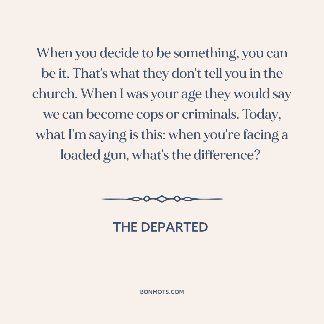 When you decide to be something, you can be it. That's what they don't tell you in the church. When I was your age they would say we can become cops or criminals. Today, what I'm saying is this: when you're facing a loaded gun, what's the difference?