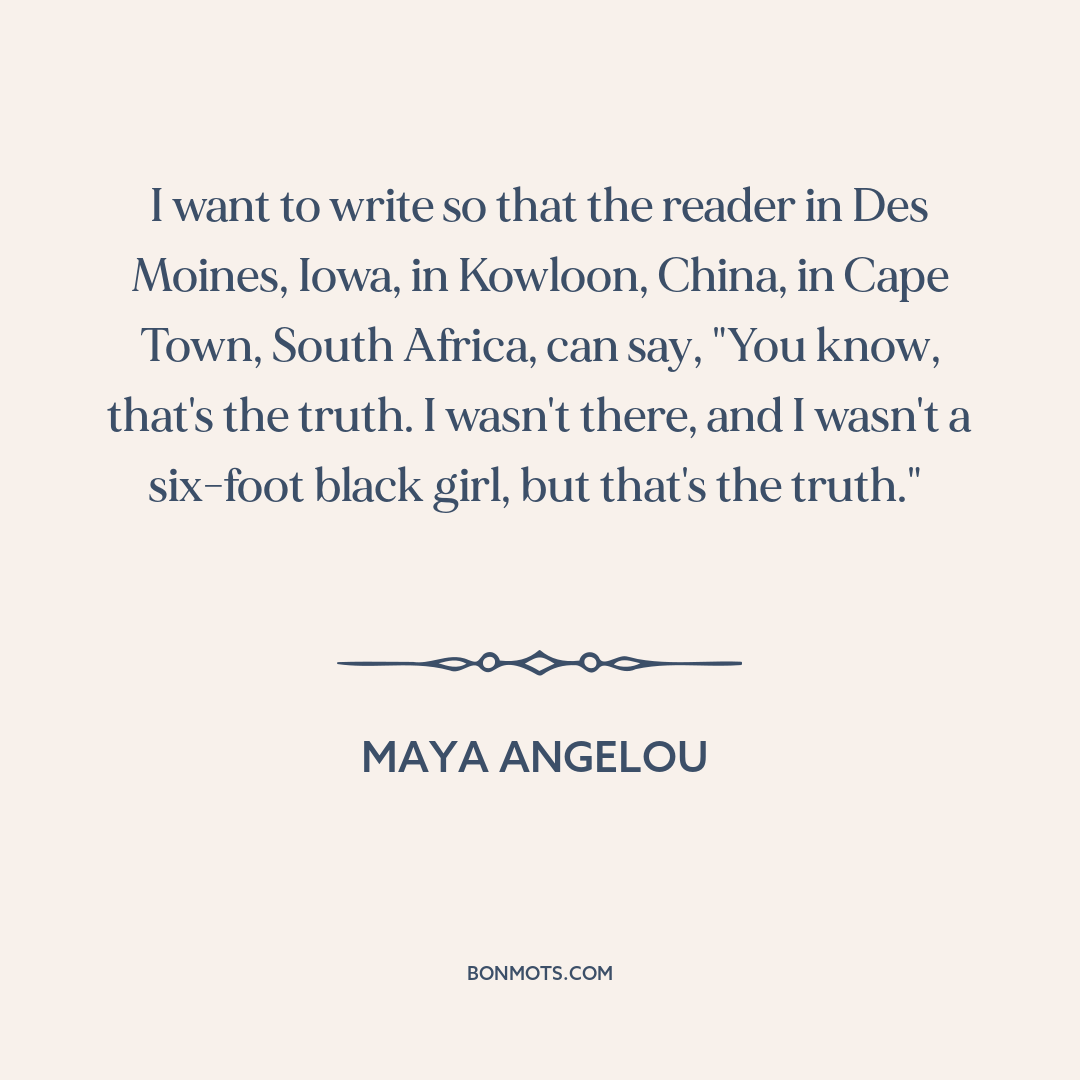 I want to write so that the reader in Des Moines, Iowa, in Kowloon, China, in Cape Town, South Africa, can say, "You know, that's the truth. I wasn't there, and I wasn't a six-foot black girl, but that's the truth."