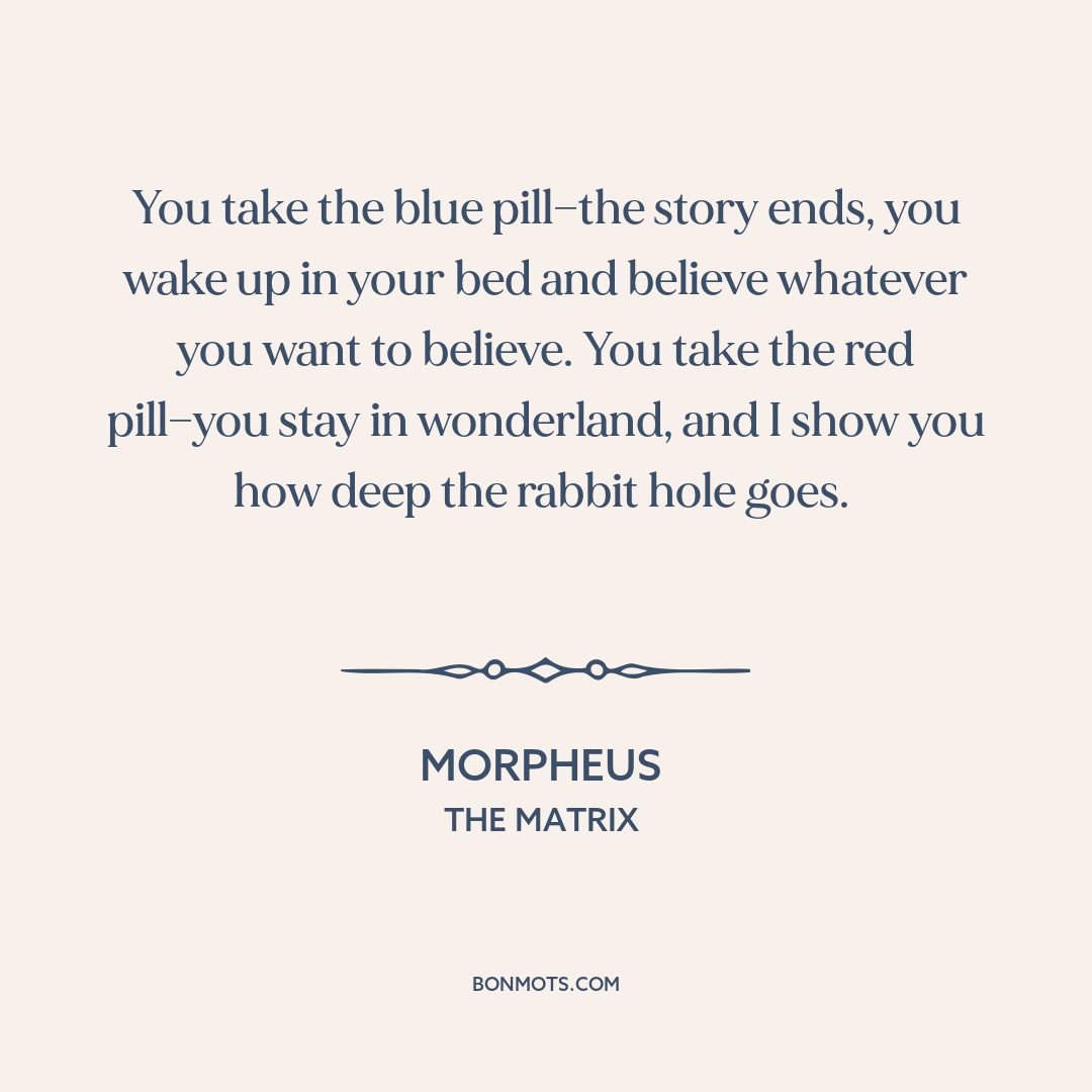 You take the blue pill—the story ends, you wake up in your bed and believe whatever you want to believe. You take the red pill—you stay in wonderland, and I show you how deep the rabbit hole goes.