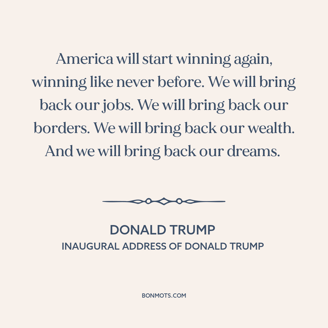 America will start winning again, winning like never before. We will bring back our jobs. We will bring back our borders. We will bring back our wealth. And we will bring back our dreams.